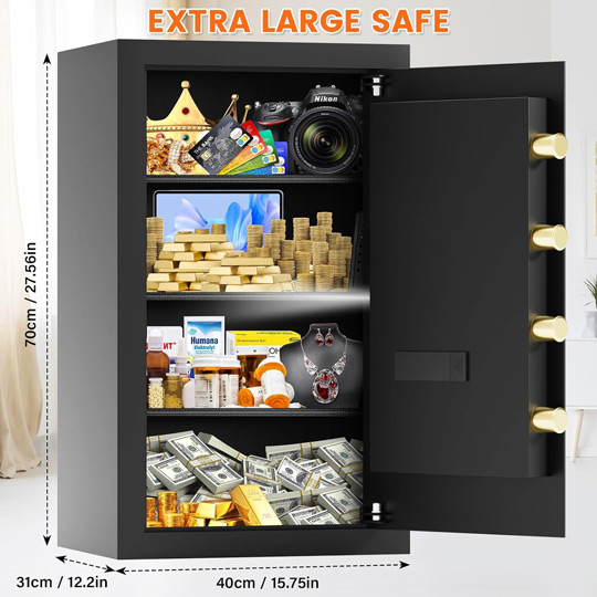 This 6.1 cu ft high-security vault offers maximum storage and protection. It features a 50mm steel door, four 30mm bolts, and pry-resistant hinges. The interior includes three removable shelves with soft lining. Access via digital keypad, backup keys, and battery backup, with anti-theft lockout. Includes an A4 fireproof/water-resistant bag (withstands 1700°F/30min). Backed by a 5-year warranty and 24/7 support.